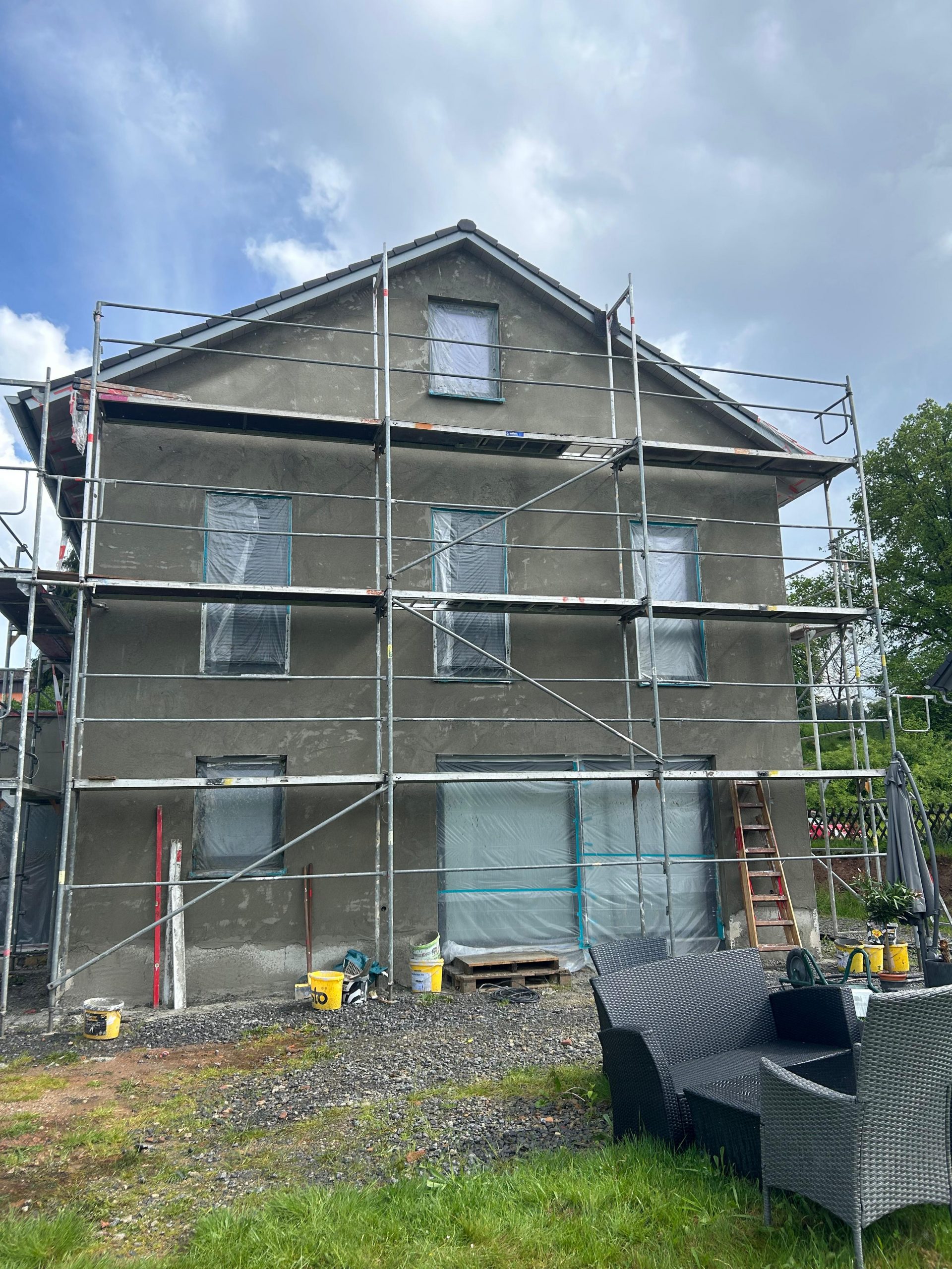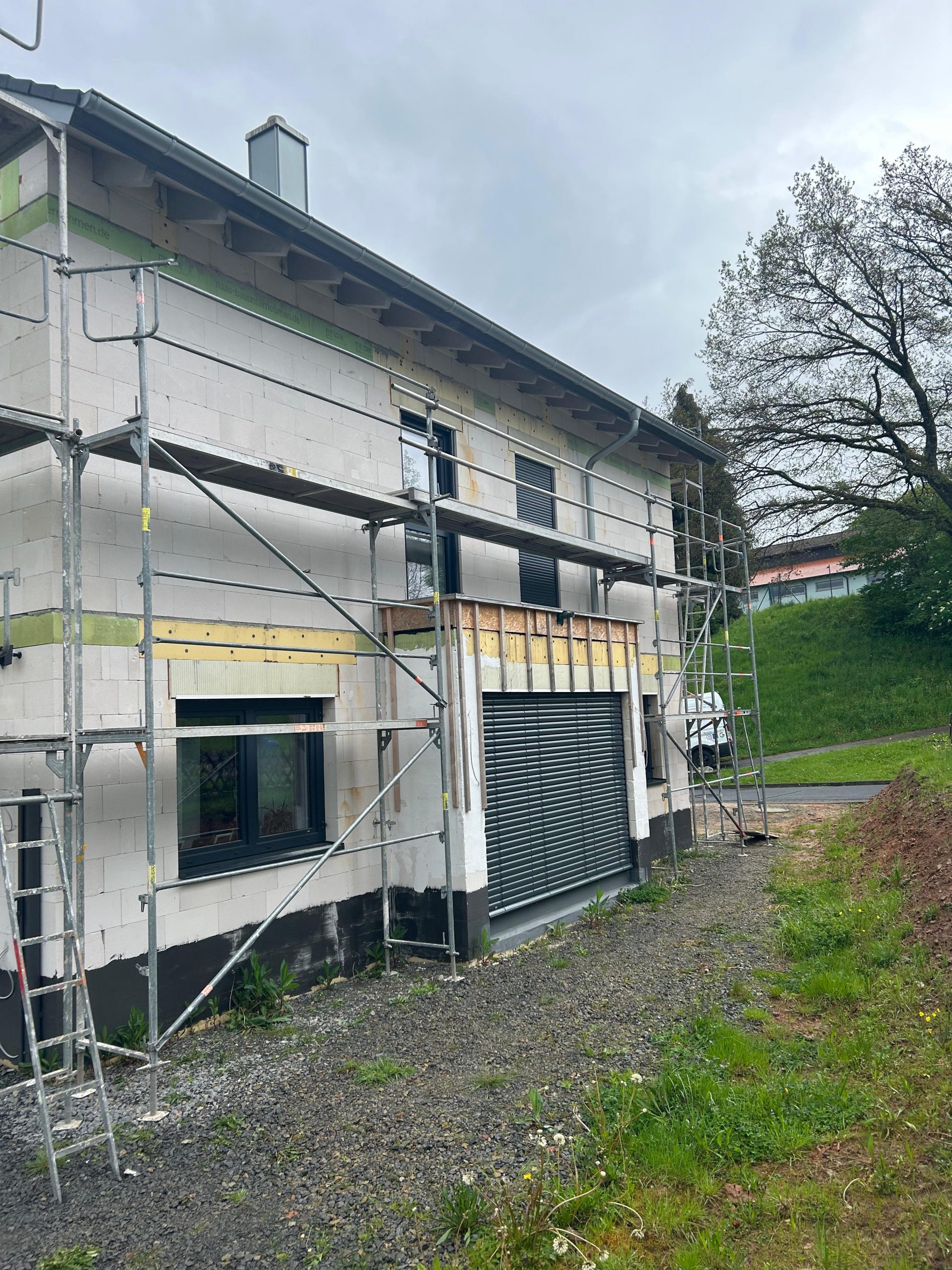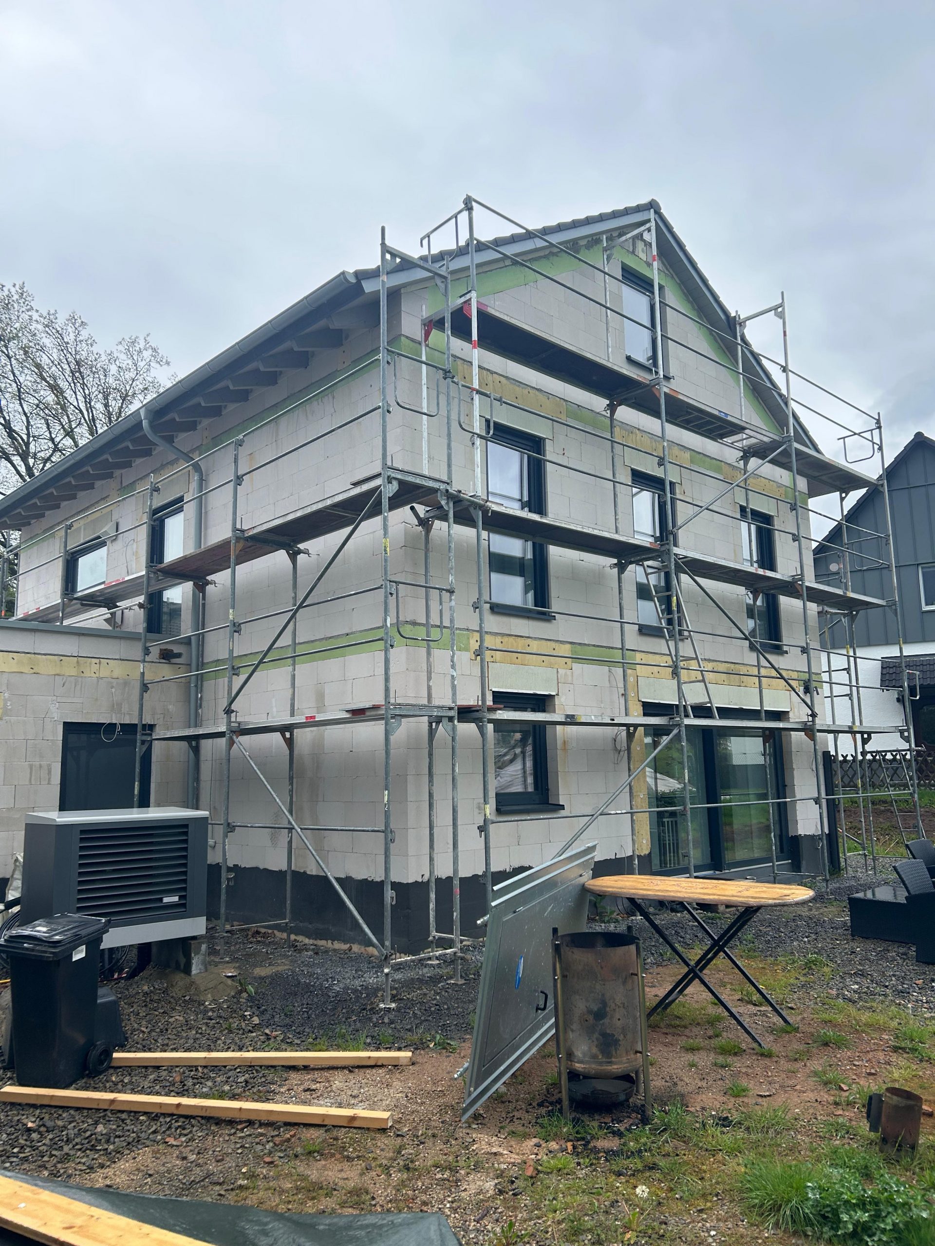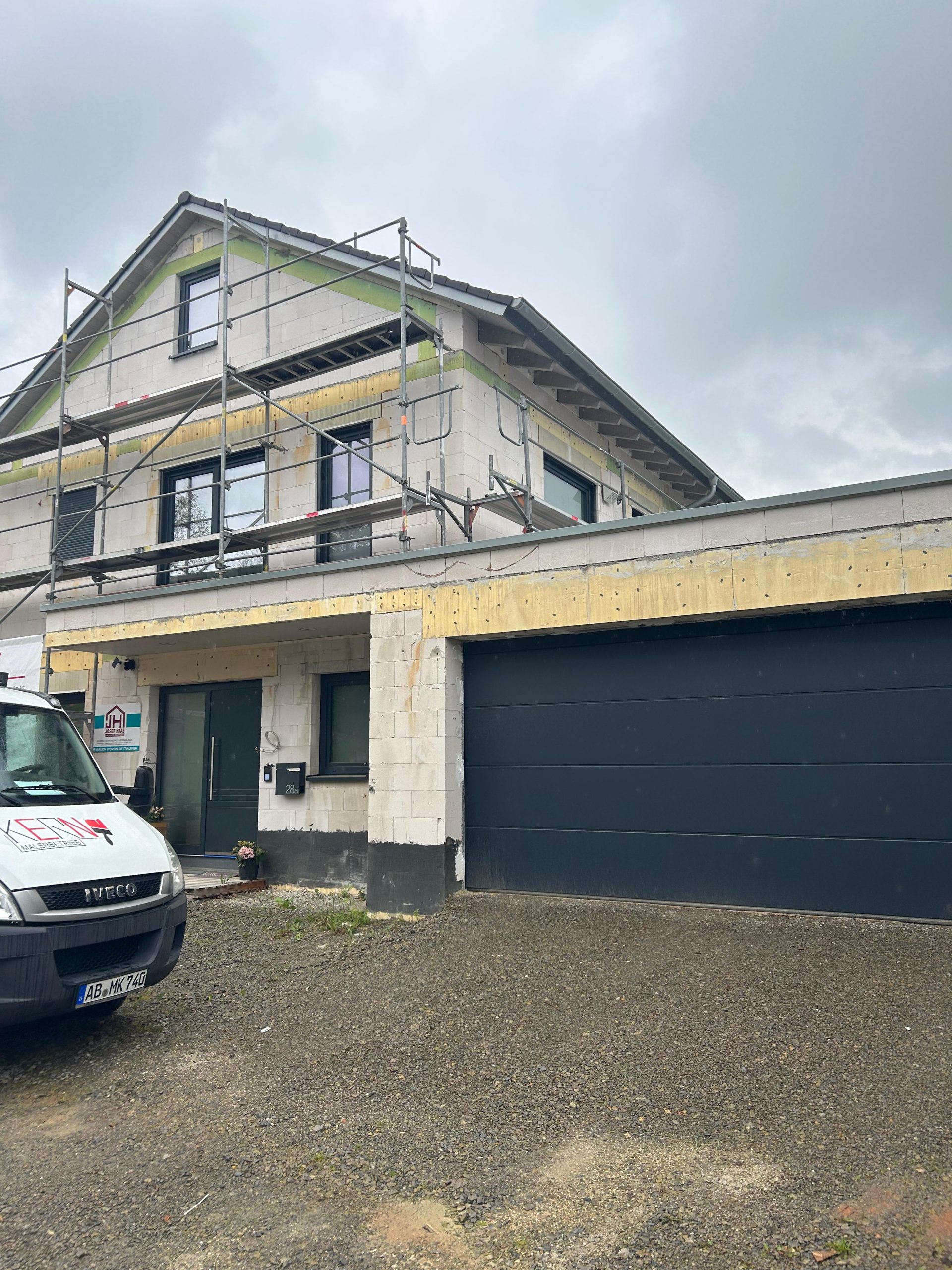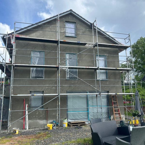 Beim Neubau dieses Einfamilienhauses wurde die komplette Fassade fachgerecht aufgebaut. Von der Grundierung bis zum fertigen Anstrich wurde jeder Schritt sorgfältig umgesetzt – für eine langlebige, geschützte Außenhaut.