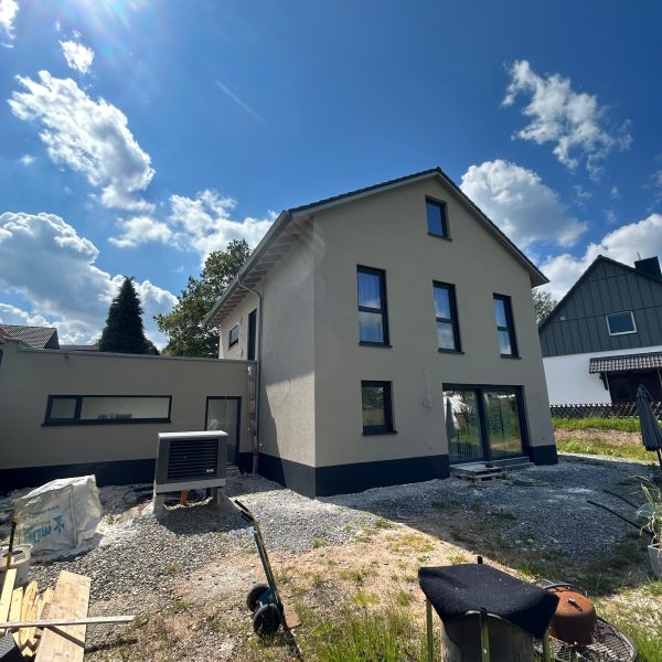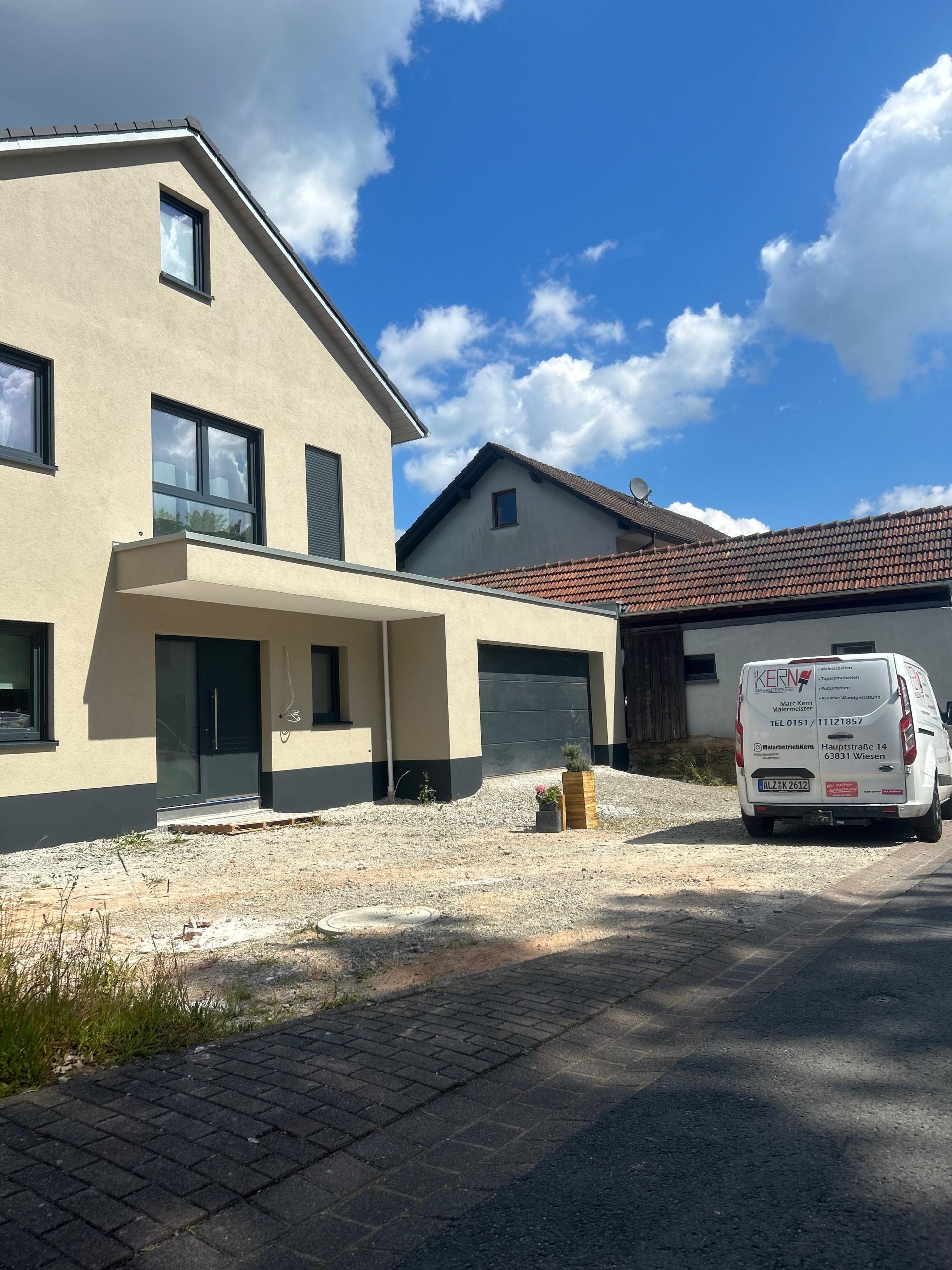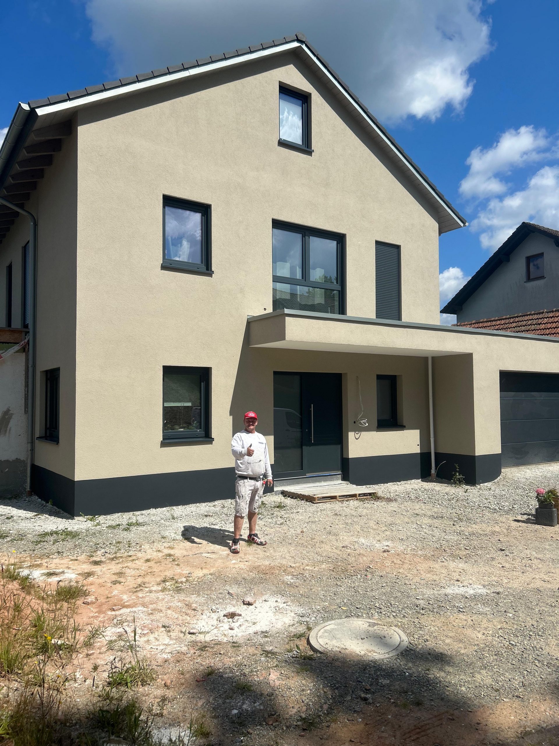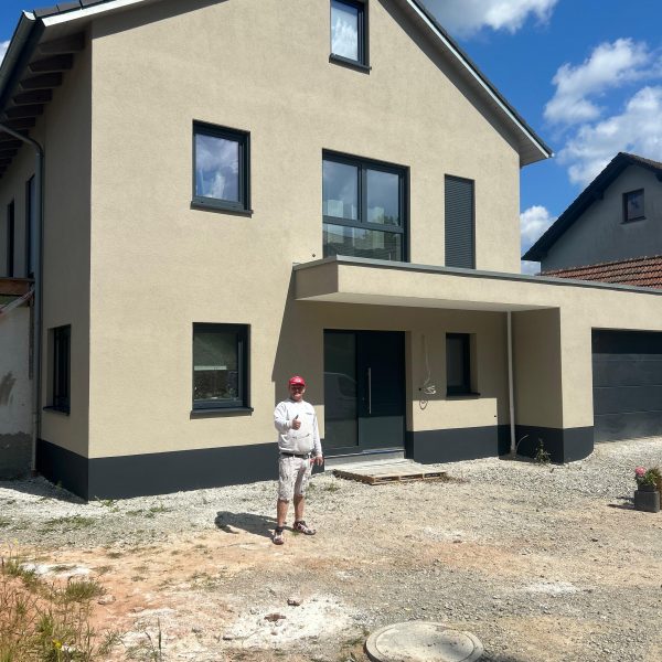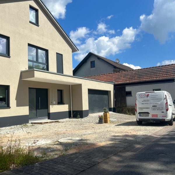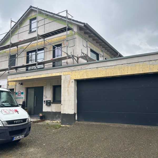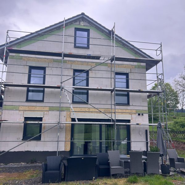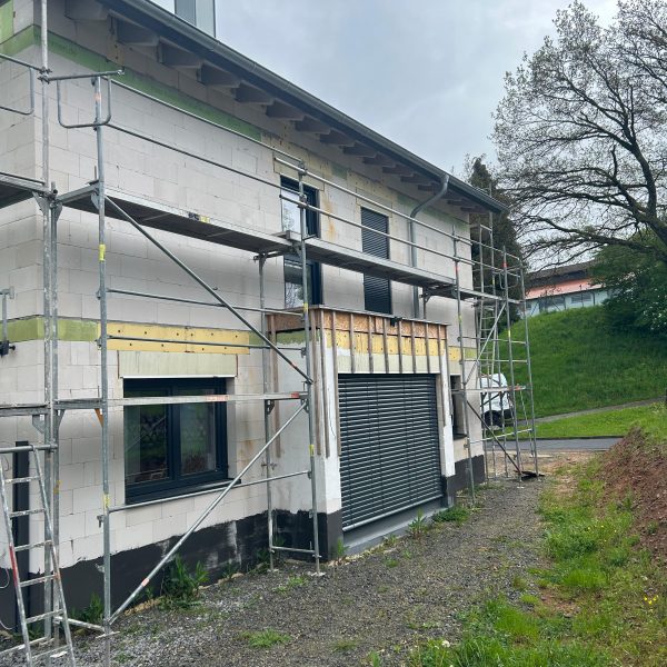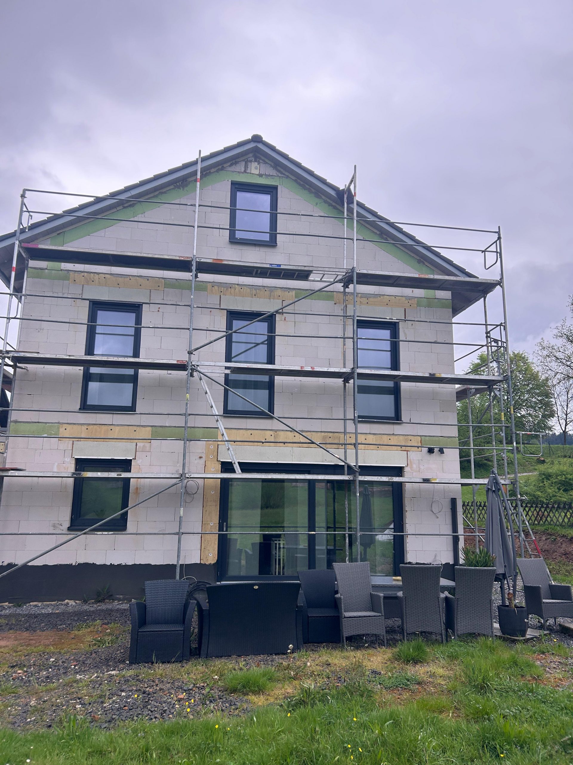 Beim Neubau dieses Einfamilienhauses wurde die komplette Fassade fachgerecht aufgebaut. Von der Grundierung bis zum fertigen Anstrich wurde jeder Schritt sorgfältig umgesetzt – für eine langlebige, geschützte Außenhaut.