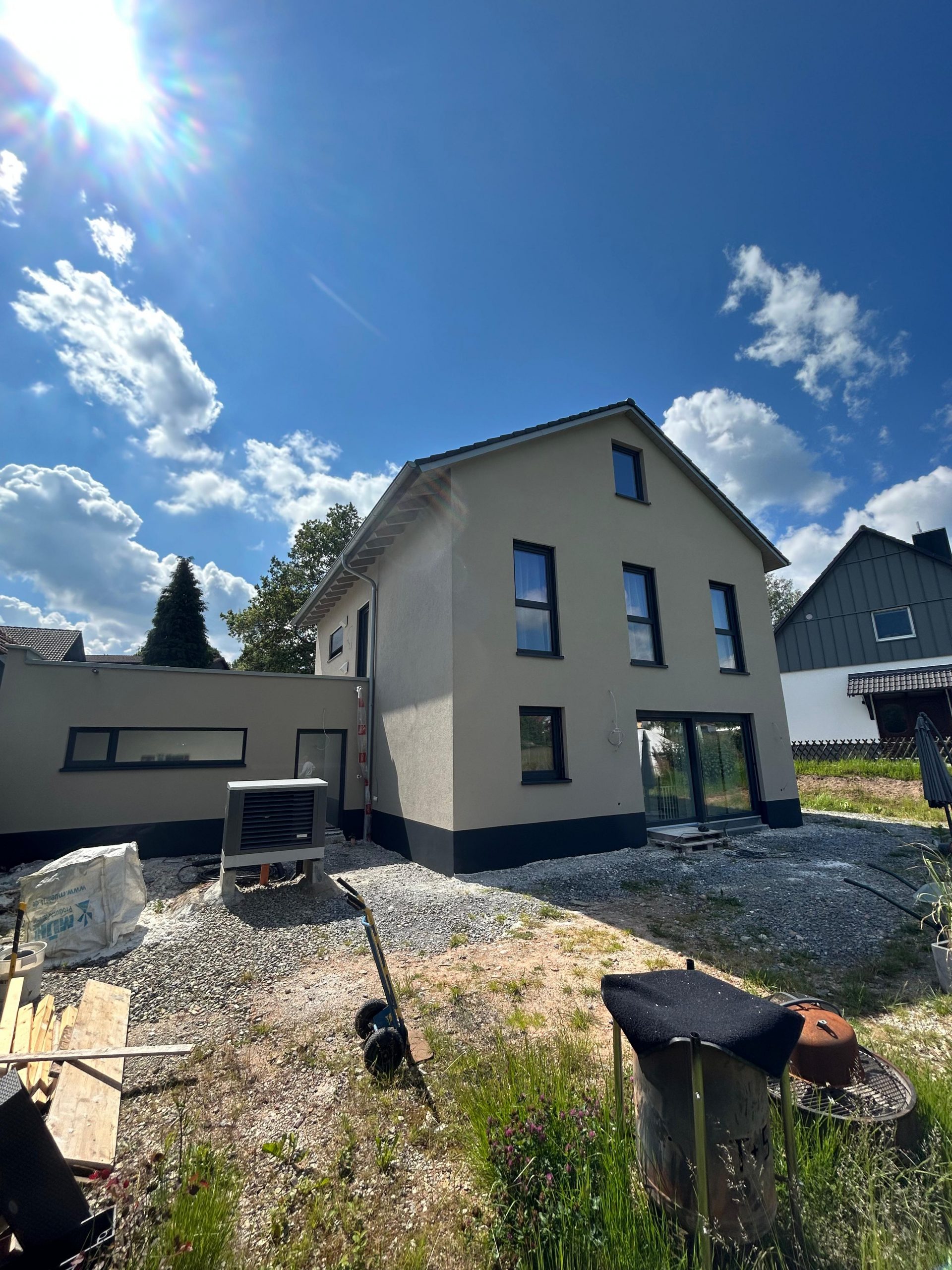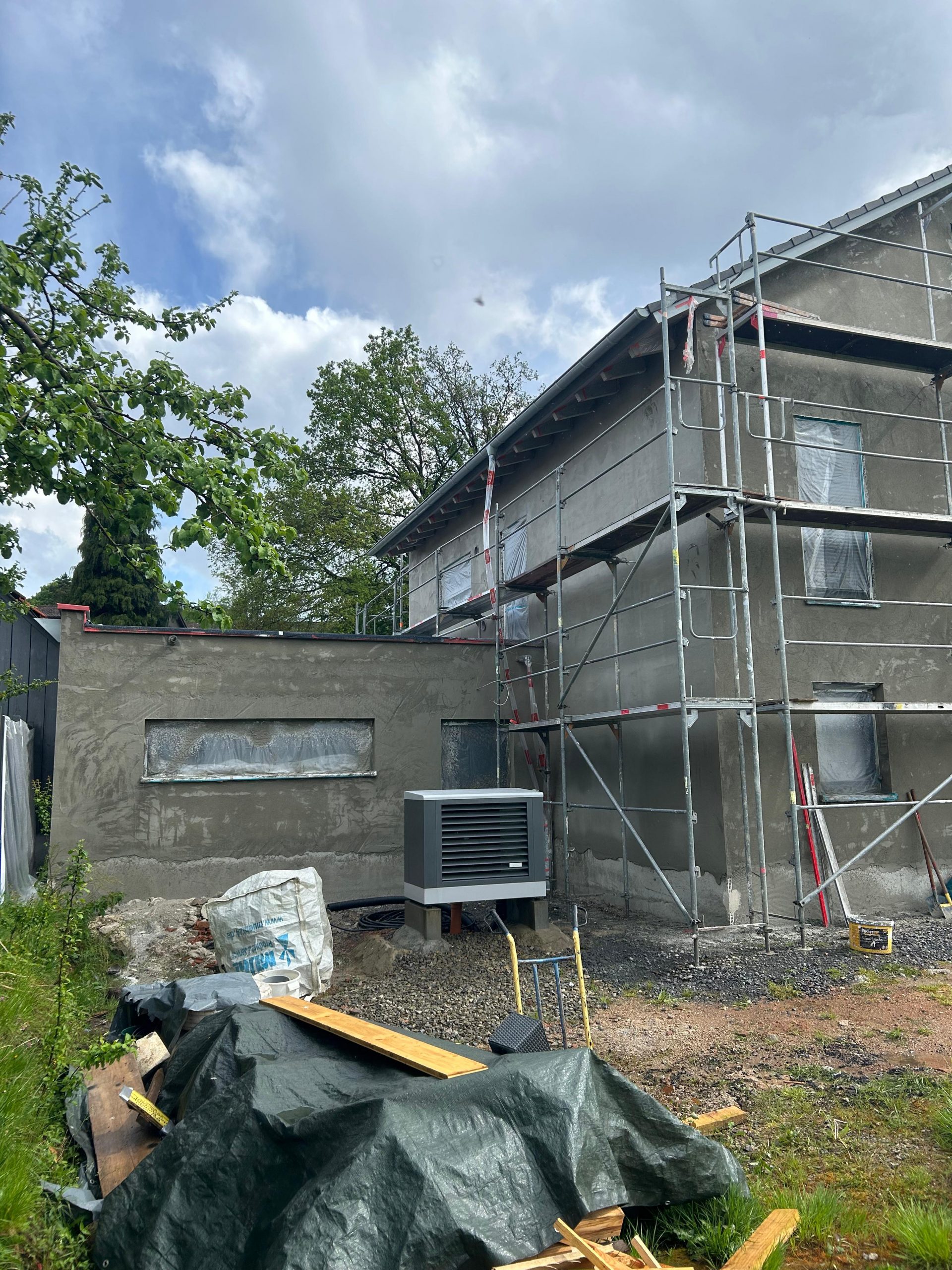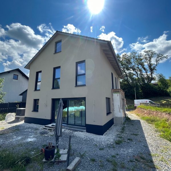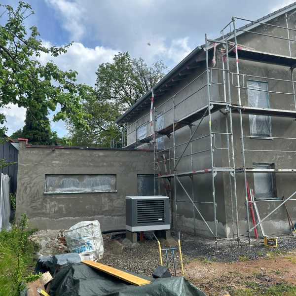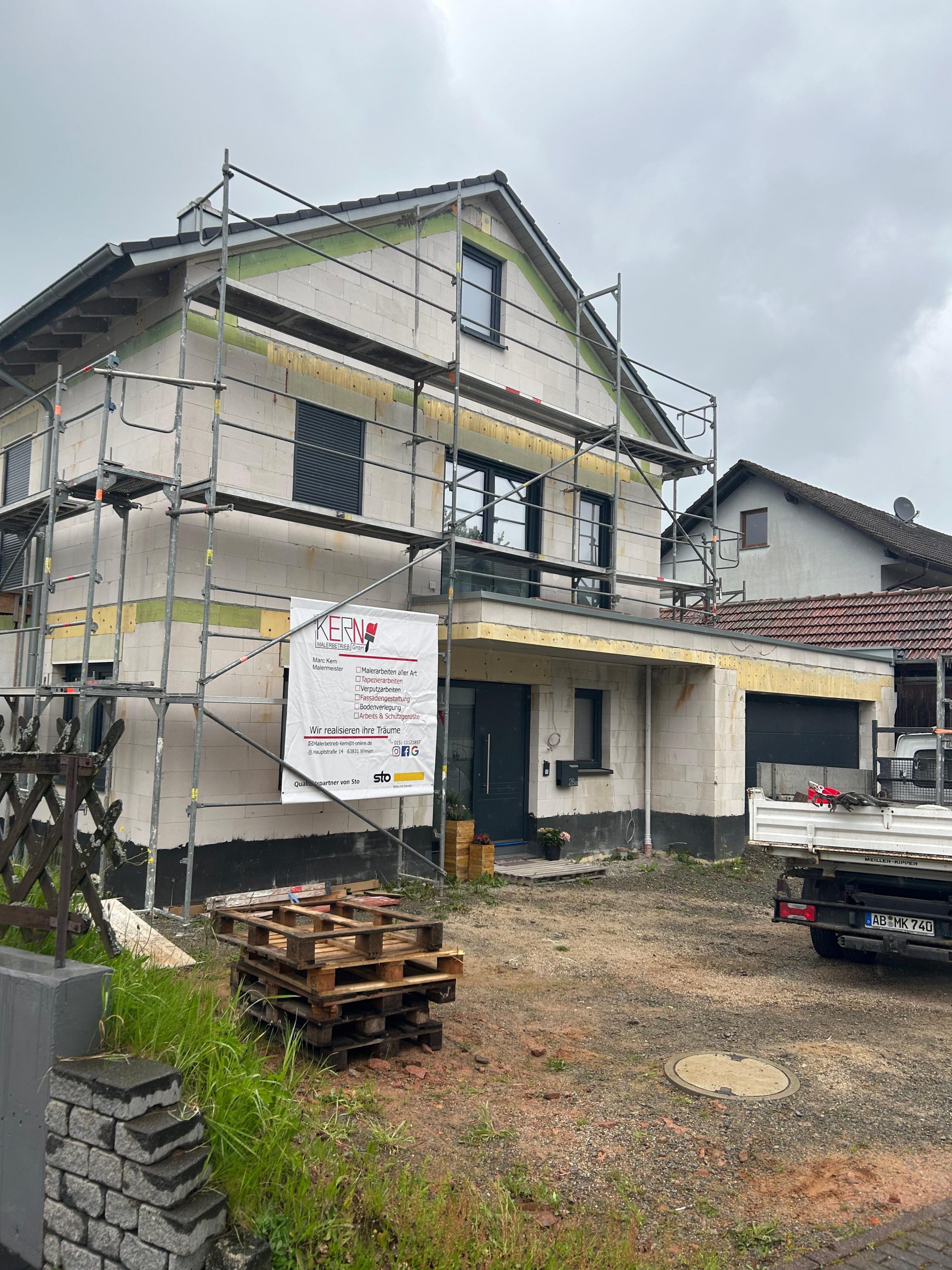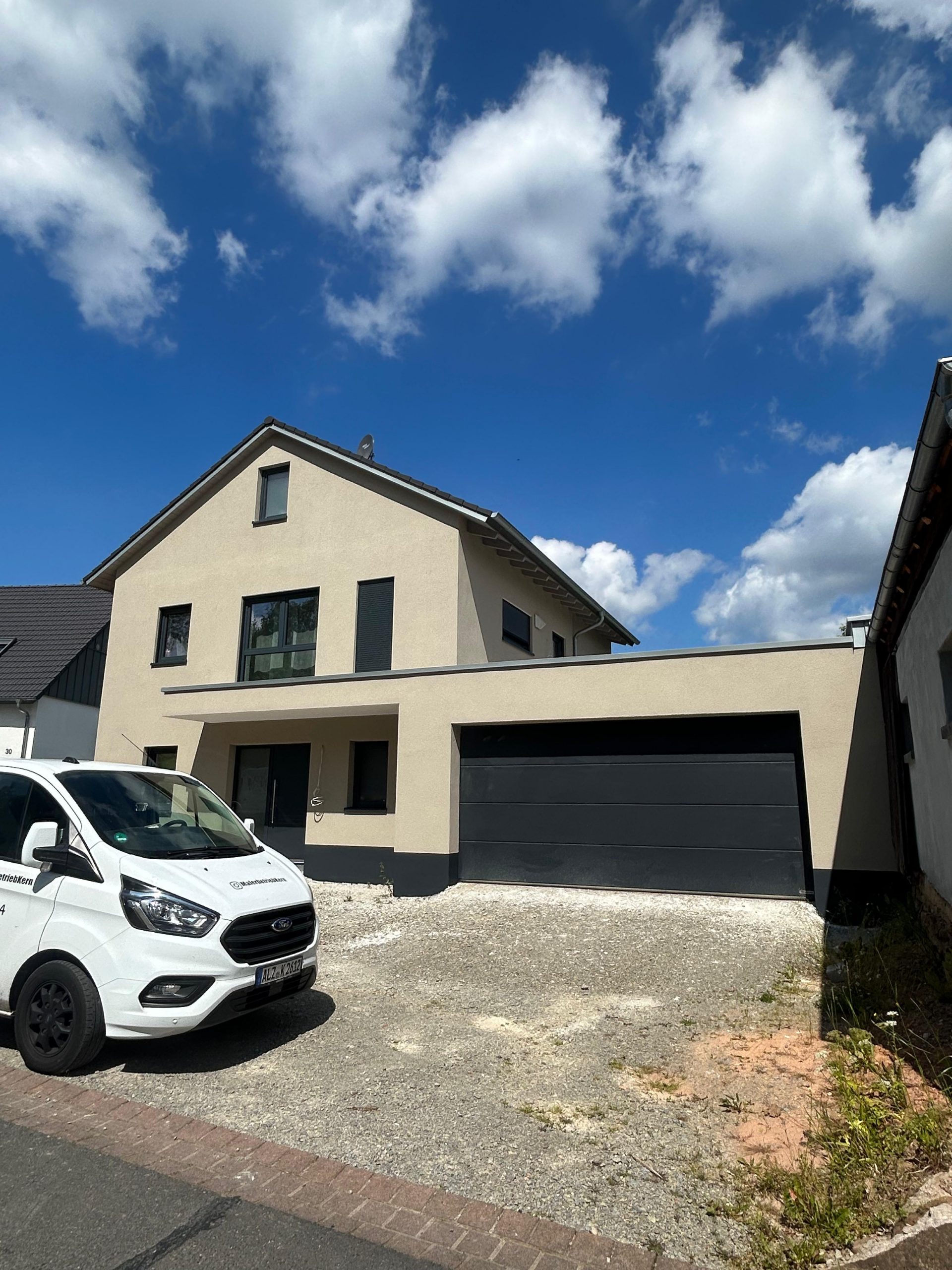 Beim Neubau dieses Einfamilienhauses wurde die komplette Fassade fachgerecht aufgebaut. Von der Grundierung bis zum fertigen Anstrich wurde jeder Schritt sorgfältig umgesetzt – für eine langlebige, geschützte Außenhaut.