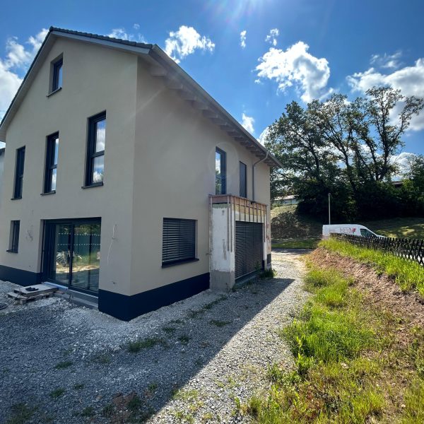 Bei diesem Neubau übernahm der Malerbetrieb sämtliche Arbeiten rund um den Fassadenaufbau. Zunächst wurde der Grundputz aufgetragen und eine Gewebearmierung eingebettet, um Rissbildung vorzubeugen. Darauf folgte ein strukturierter Oberputz, der die Basis für die spätere Farbgestaltung bildet.